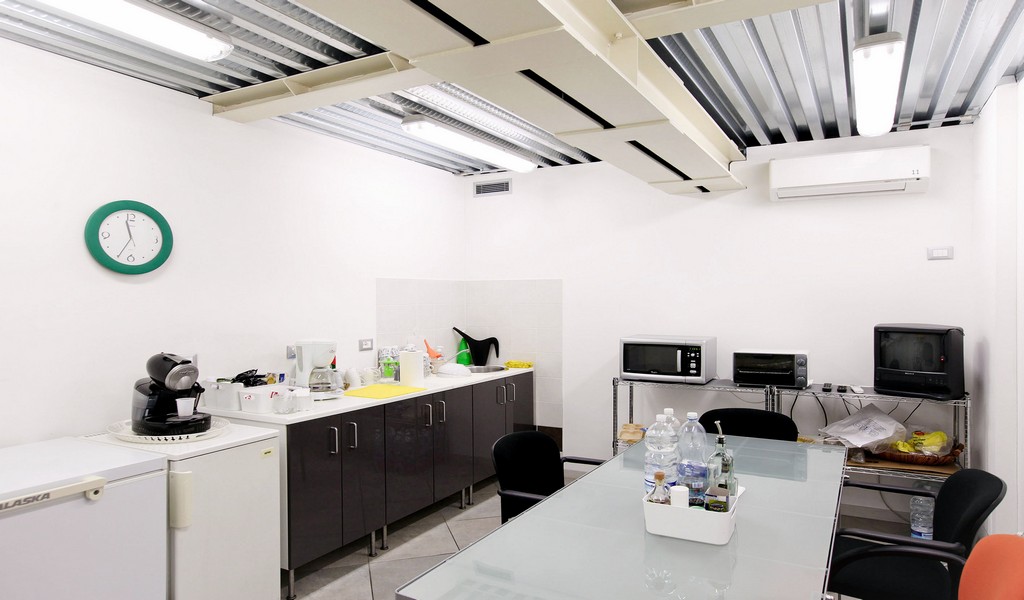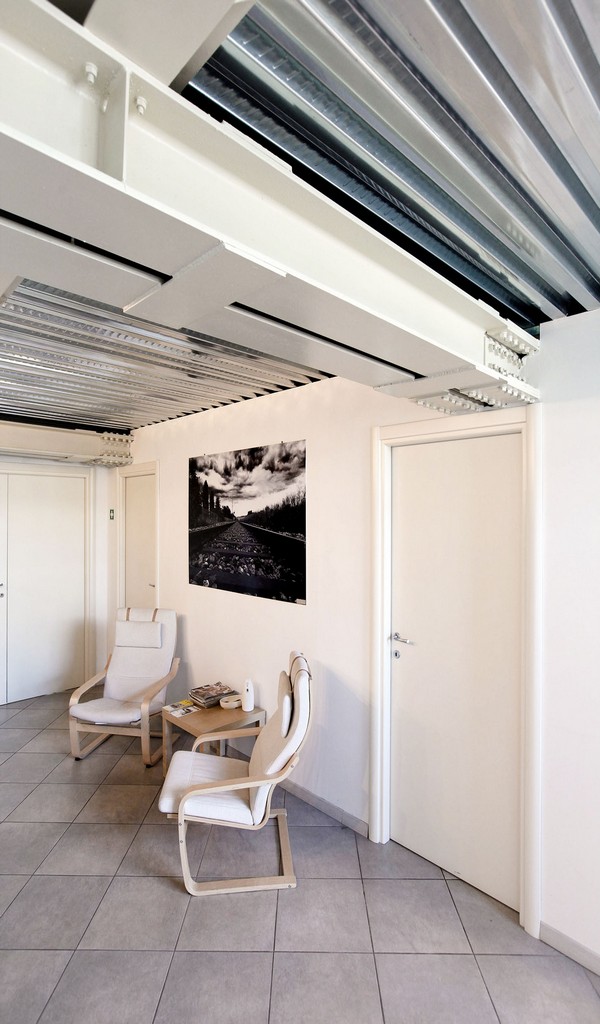 RISULTATI: Si è ottenuto uno spazio estremamente piacevole e funzionale con una grande attenzione anche al lato estetico ottenuto mediante l’utilizzo di colori chiari e arredi pratici ed essenziali. Lo spazio così è stato così distribuito ed organizzato: ingresso attesa dal quale si accede a sinistra al grande laboratorio artigianale e a destra all’ufficio open space; frontalmente, ovvero nella zona interessata dal soprastante soppalco di altezza cm.240, si accede alla zona servizi (spogliatoi, bagni, mensa).